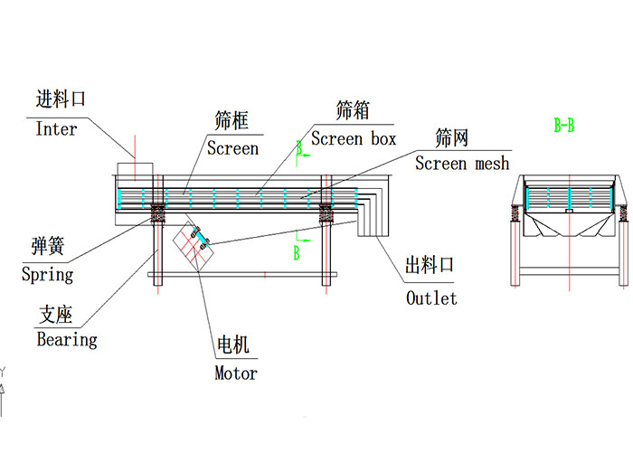 不銹鋼直線震動篩主要由篩箱、篩框、篩網、振動電機、電機臺座、減振彈簧、支架等組成。不銹鋼直線震動篩為雙振動電機驅動。當兩臺振動電機做同步、反向旋轉時,其偏心塊所產生的激振力在平行于電機軸線的方向相互抵消,在垂直于電機軸的方向疊為一合力,因此篩機的運動軌跡為一直線,兩電機軸相對篩面在垂直方向有一傾角,在激振力和物料自重力的合力作用下,物料在篩面上被拋起跳躍或向前作直線運動,從而達到對物料進行篩選和分級的目的。